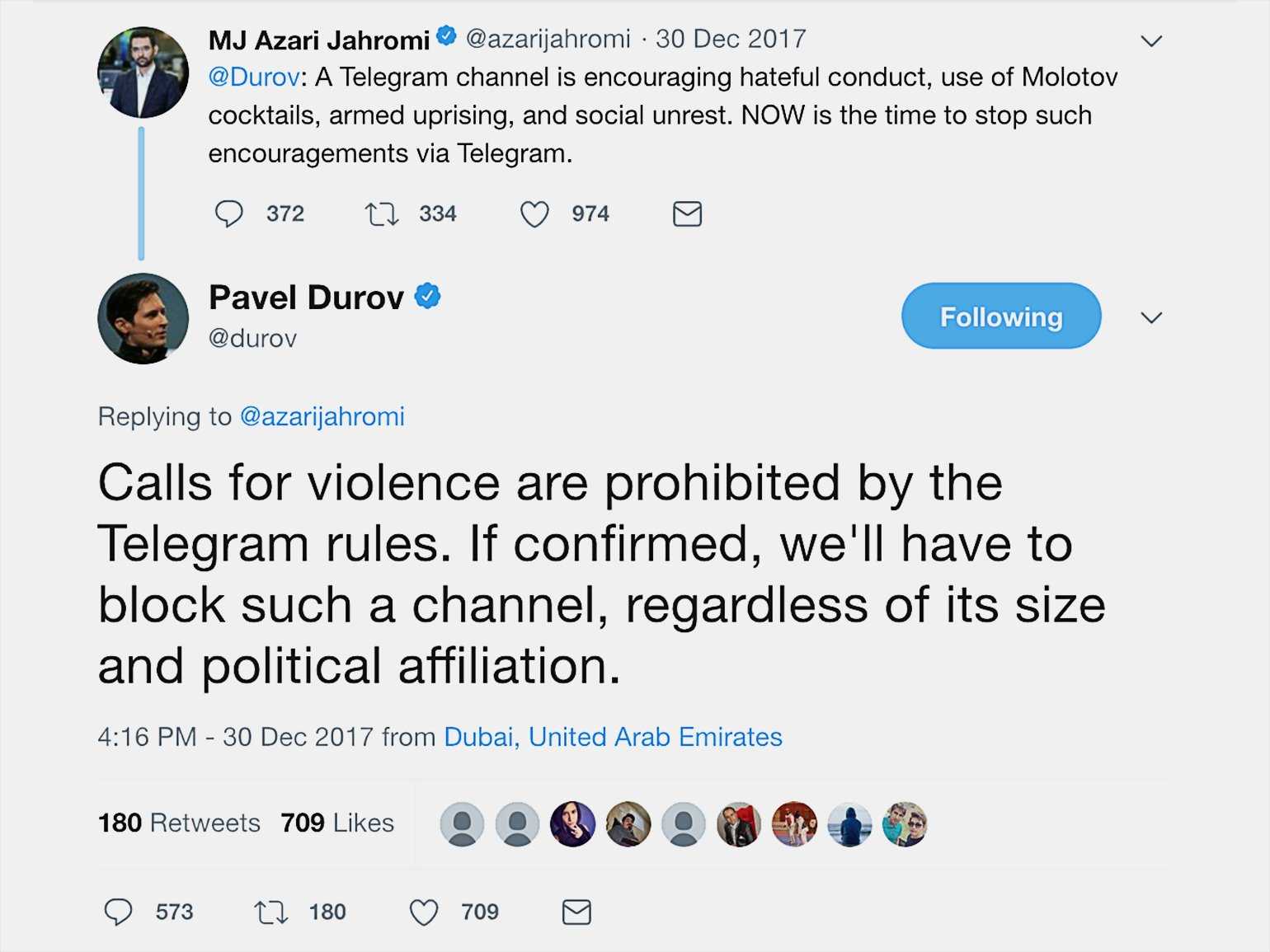 Россия и США не единственные страны, где Telegram столкнулся с претензиями со стороны регуляторов. В Иране Telegram был популярнее, чем в России. Ещё в 2017 году там было в четыре раза больше пользователей — 40 млн против 10 млн. В то время в стране начались протестные выступления: люди были недовольны коррупцией, экономическими проблемами и властью исламского духовенства. Главным рупором оппозиции стали Telegram-каналы. Министр коммуникаций Мохаммад-Джавад Азари Джахроми обратился лично к Дурову через Twitter и призвал заблокировать популярный канал, который призывал к вооружённому восстанию. В ответ Дуров заявил, что подобные призывы в Telegram запрещены и если информация подтвердится — канал обязательно заблокируют.