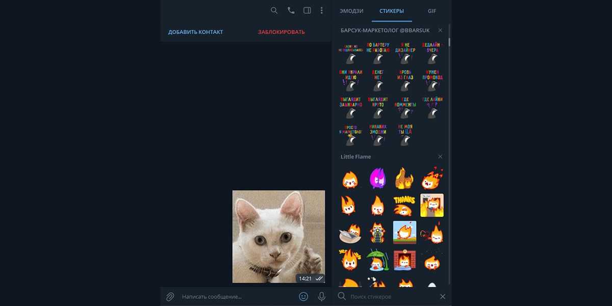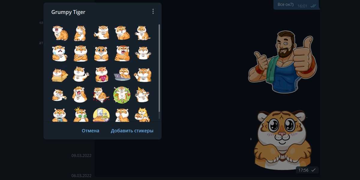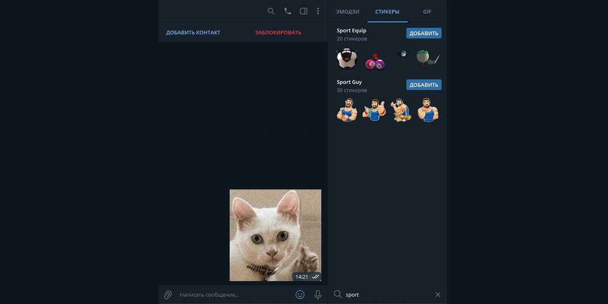 Немного о том, как найти стикеры в Telegram, если один из них прислал вам друг. Если в диалоге появилась классная картинка, вы хотите посмотреть полный сет и добавить его в свою коллекцию – просто нажмите на изображение. Стикерпак загрузится автоматически: пролистайте, оцените. Понравился? Жмите на кнопку «Добавить» внизу окна.