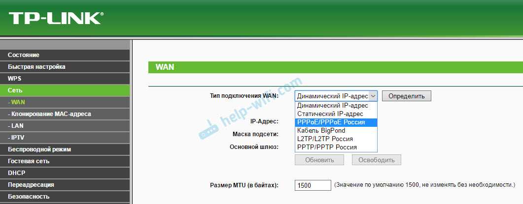 После установки роутера мы заходим в его панель управления. В раздел, где задаются настройки подключения к интернету. Обычно он называется «Интернет», «WAN», «Internet». В этом разделе выбираем тип подключения которое использует наш провайдер, и задаем необходимые параметры. Которые выдает провайдер при подключении к интернету. На роутерах TP-Link это выглядит примерно вот так: