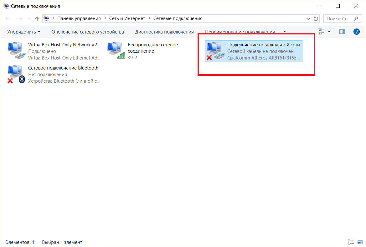 - в открывшемся окне сетевых соединений должно быть несколько значков. Необходимо выбрать перечеркнутое красным крестом, которое будет называться «Подключение по локальной сети» или «Беспроводное подключение» в зависимости от типа доступа;