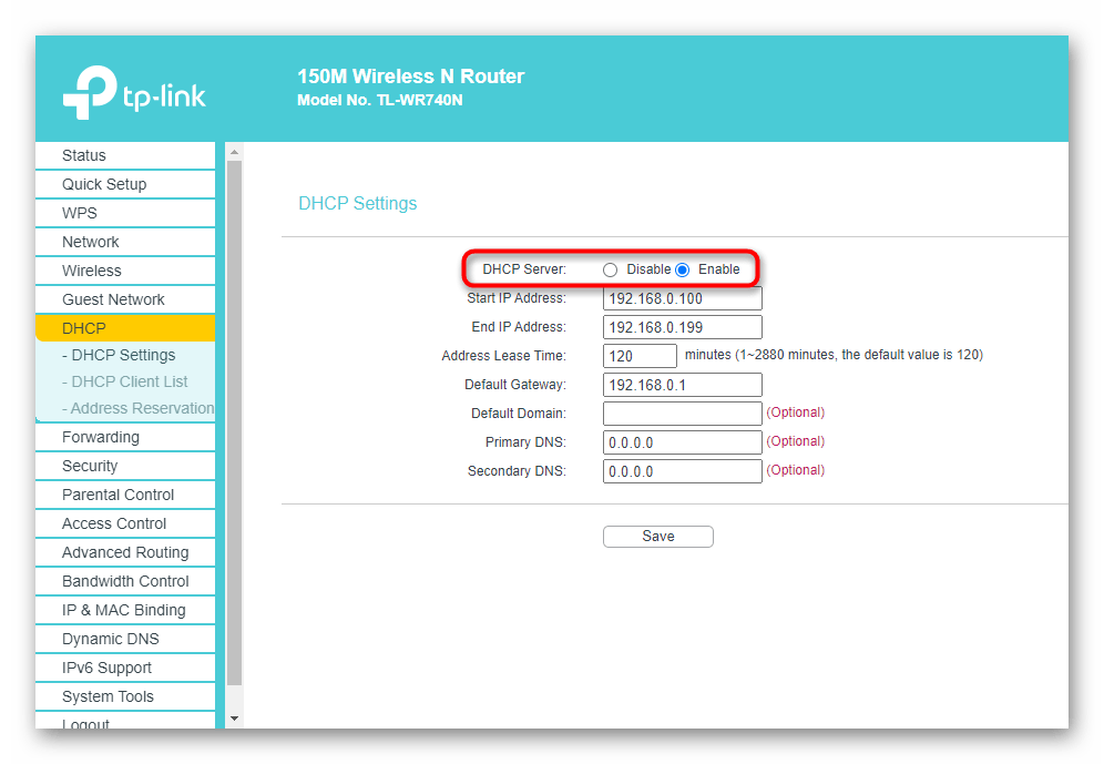 По умолчанию DHCP-сервер должен быть включен в веб-интерфейсе роутера, а отвечает он за автоматическое получение IP-адреса для каждого участника локальной сети. Если этот параметр отключен или по каким-то причинам настроен неправильно, могут возникать проблемы с доступом к интернету.