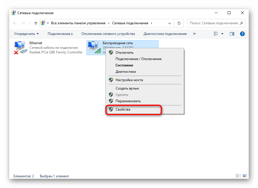 Дальше нужно нажать правой кнопкой мыши и открыть «Свойства» того адаптера, при подключении через который у вас возникла эта ошибка. В случае с Windows 10: «Ethernet» – это подключение по кабелю, а «Беспроводная сеть» – подключение по Wi-Fi.