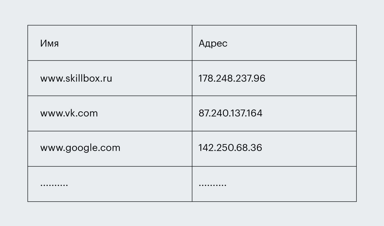 Например, вы заходите на www.skillbox.ru и просите браузер подключить вас к нему. Он обращается к серверу, а тот — к своей базе адресов, чтобы найти похожее название. Если находит — возвращает браузеру IP-адрес, а браузер, в свою очередь, использует его, чтобы запросить главную страницу и показать её вам. Сайту skillbox.ru соответствует IP-адрес 178.248.237.96 (кстати, попробуйте ввести в адресную строку браузера эти циферки).