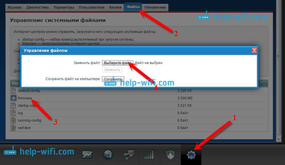 Дальше, заходим в настройки нашего роутера, и переходим на вкладку Система — Файлы (в старой панели управления вкладка Система — Микропрограмма). Нажимаем на файл firmware и на кнопку Выберите файл.