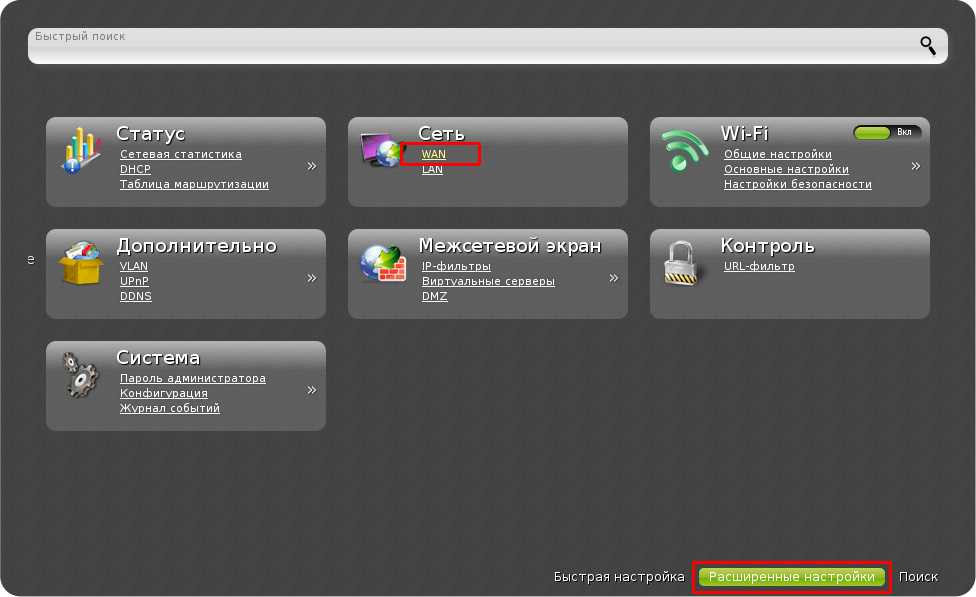 Переходим в расширенные настройки и на вкладке Сеть выбираем пункт WAN