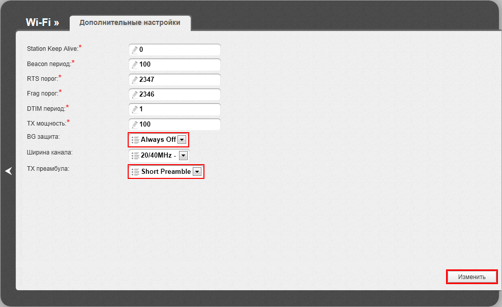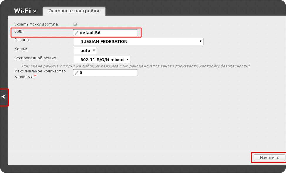 В открывшемся окне в поле SSID укажите имя вашей беспроводной сети, в соответствием с номером квартиры, например, ufanet56 или default56. Нажмите кнопку Изменить