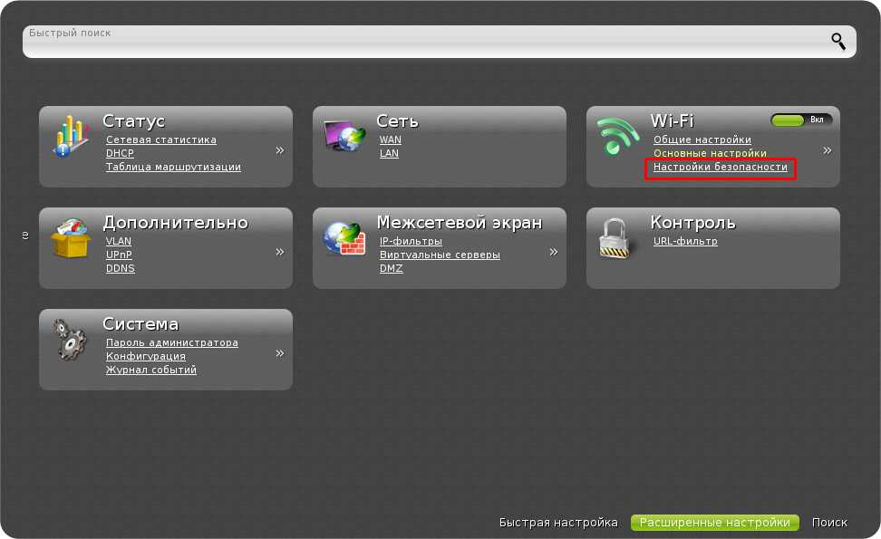 В этой же вкладке Вай-фай следует выбрать раздел «Настройки безопасности», где нужно установить пароль на Wi-Fi маршрутизатора. Для этого в поле «Сетевой аутентификации» выбирается режим WPA2-PSK, ввести в «ключ шифрования PSK» необходимый пароль для точки доступа и сохранить введенные данные.