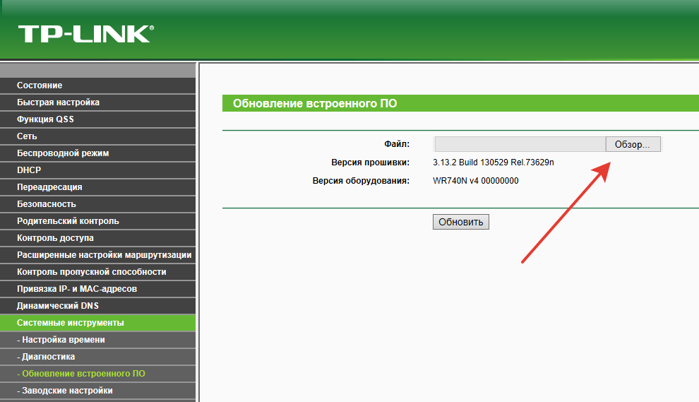 В открывшемся окне нажмите Обзор и указываете расположение скачанного файла прошивки, запускаем и дожидаемся окончания обновления прошивки.