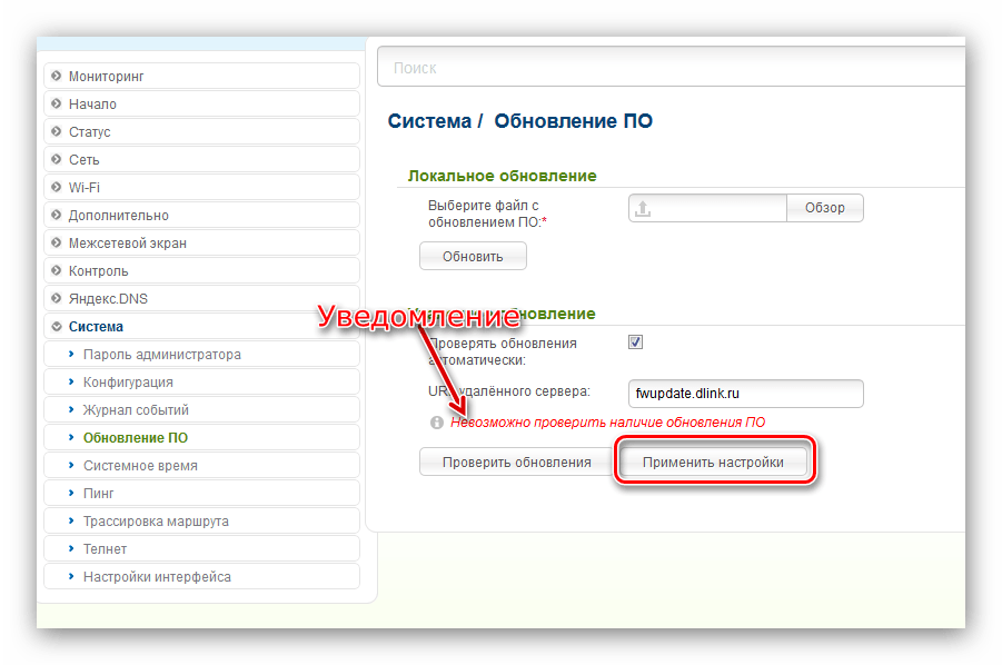 - Если обновления прошивки будут обнаружены, то вы получите уведомление под строкой адреса сервера апдейтов. В таком случае станет активной кнопка «Применить настройки» — нажмите её для начала обновления.
