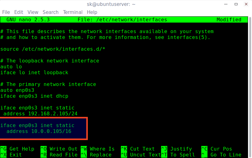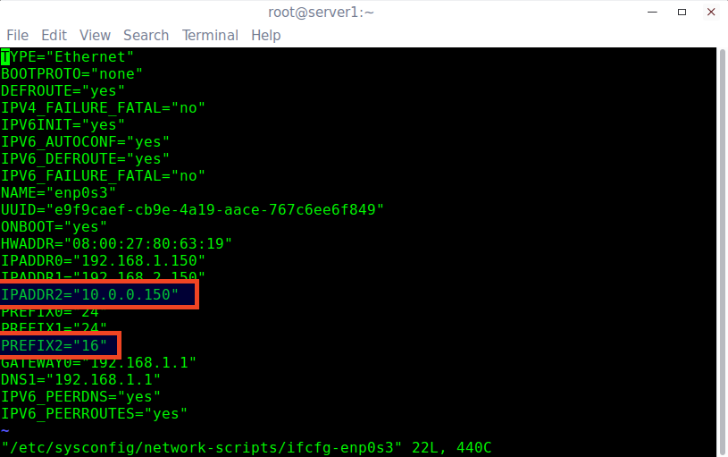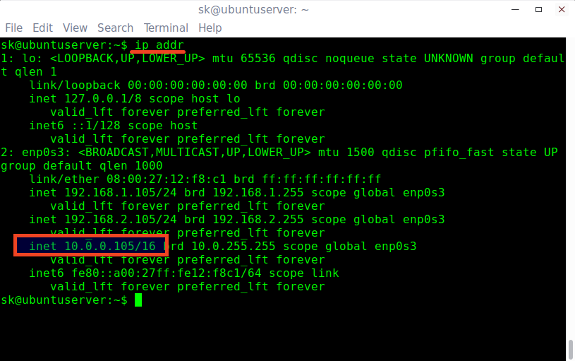 1: lo: <LOOPBACK,UP,LOWER_UP> mtu 65536 qdisc noqueue state UNKNOWN link/loopback 00:00:00:00:00:00 brd 00:00:00:00:00:00 inet 127.0.0.1/8 scope host lo valid_lft forever preferred_lft forever inet6 ::1/128 scope host valid_lft forever preferred_lft forever 2: enp0s3: <BROADCAST,MULTICAST,UP,LOWER_UP> mtu 1500 qdisc pfifo_fast state UP qlen 1000 link/ether 08:00:27:80:63:19 brd ff:ff:ff:ff:ff:ff inet 192.168.1.150/24 brd 192.168.1.255 scope global enp0s3 valid_lft forever preferred_lft forever inet 192.168.2.150/24 brd 192.168.255.255 scope global enp0s3 valid_lft forever preferred_lft forever inet 10.0.0.150/16 brd 10.255.255.255 scope global enp0s3 valid_lft forever preferred_lft forever inet6 fe80::a00:27ff:fe80:6319/64 scope link valid_lft forever preferred_lft forever