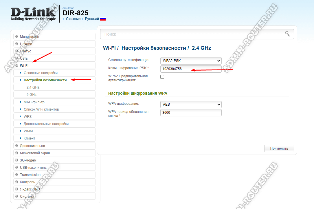 После того как войдете в меню настроек роутера (меню на всех моделях разное, но принцип один и тот же) раскройте пункт «Wi-Fi». Появятся разделы, выбираем «Настройка безопасности». Напротив строки «Ключ шифрования PSK» будет написан ключ.
