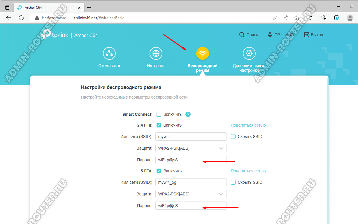 Начнём с роутера TP-Link. Для примера возьмём Archer C64. Чтобы посмотреть пароль Вай-Фай, надо открыть раздел меню «Беспроводной режим»: