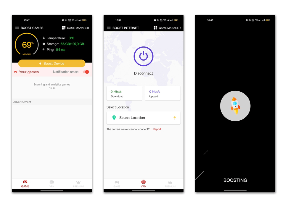 GameBox Booster легкий и быстрый, не требовательный к ресурсам системы. Ускоритель позволяет запустить игры даже на маломощных устройствах. Предоставляется информация о температуре аккумулятора мобильного устройства, пинге и свободном пространстве в локальном хранилище, а также загруженности ОЗУ. Основные функции доступны бесплатно, но можно приобрести подписку, после чего откроются новые локации при использовании VPN, будет удалена реклама и разблокированы дополнительные функции для увеличения скорости игр.