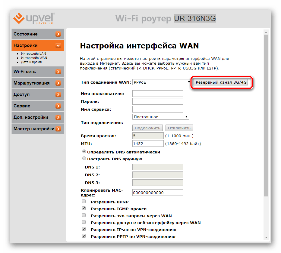 Определенными моделями поддерживается 3G и 4G. Они корректируются в отдельном окне, переход в него осуществляется кликом на «Резервный канал 3G/4G»