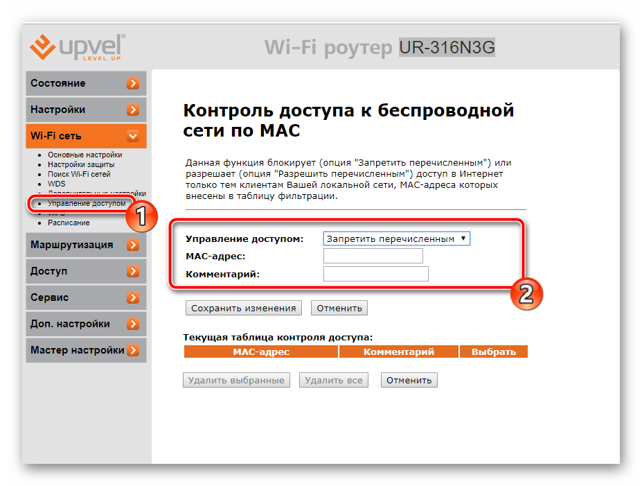 Контроль подключений к беспроводной сети осуществляется через раздел «Управление доступом»