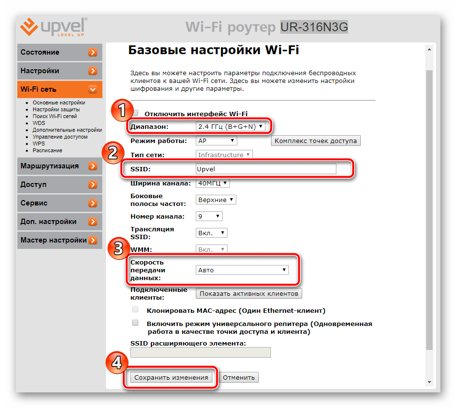 Также необходимо изменить (поставить) пароль от Wi-Fi на роутере Upvel. Из выпадающего списка взять подходящий тип шифрования для защиты Wi-Fi от внешних подключений. Рекомендуется использовать протокол «WPA2». Затем ввести ID-ключ, который необходимо запомнить или сохранить в надежном месте.