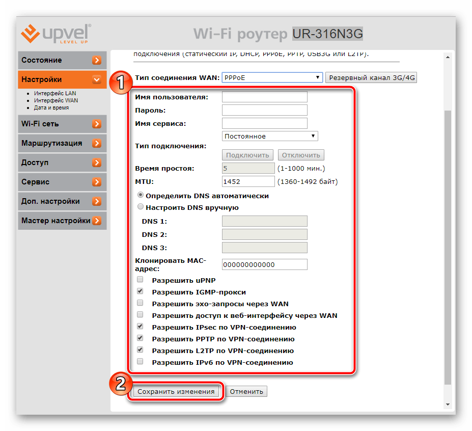 Введите имя пользователя, пароль, DNS, MAC-адрес и прочие данные, исходя из предоставленной провайдером документации. В конце не забудьте нажать на «Сохранить изменения»