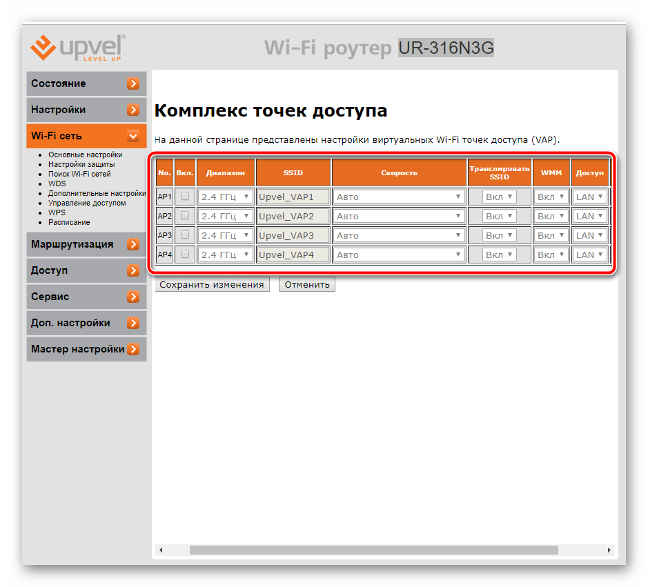 Вы увидите список всех VAP и сможете каждой из них присвоить индивидуальные параметры.
