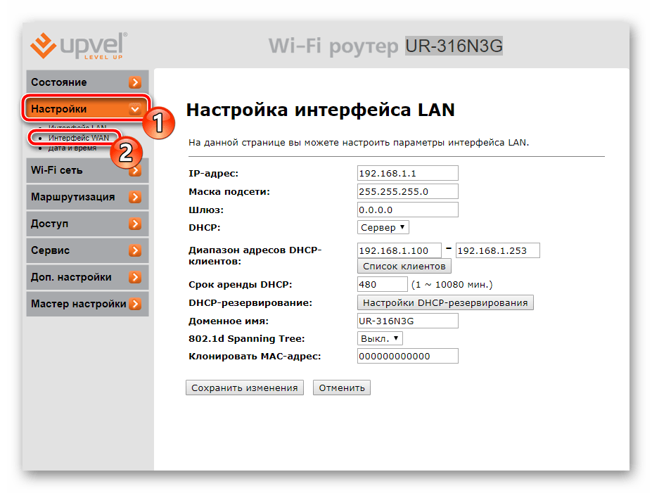 Первоочередно необходимо разобраться с проводным соединением — после удачного входа в веб-интерфейс роутера выполните следующие действия: