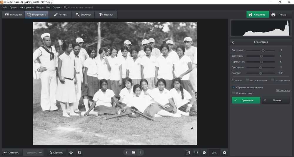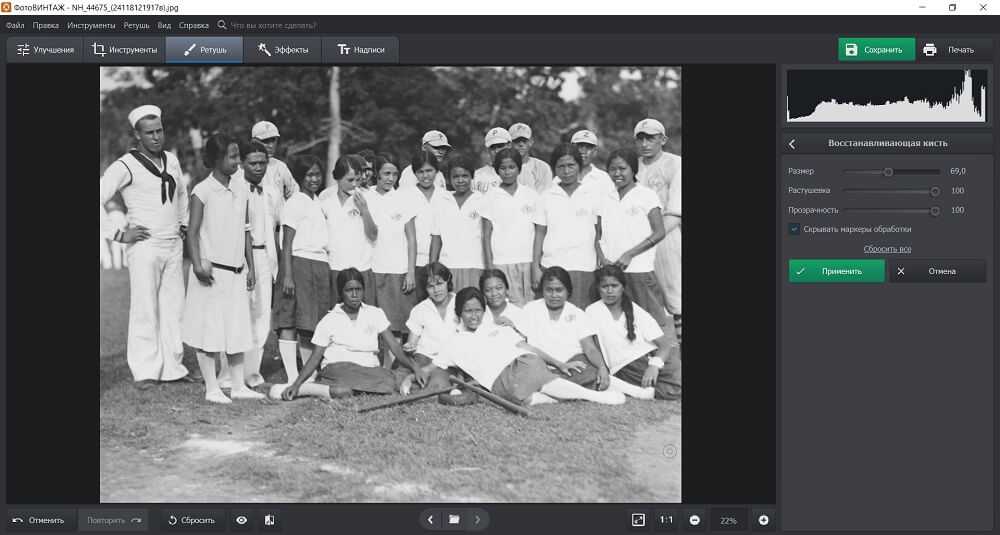 Помимо этого приложение позволит отретушировать снимок: скрыть пылинки, трещины, крупные дефекты, удалить предметы и пятна.