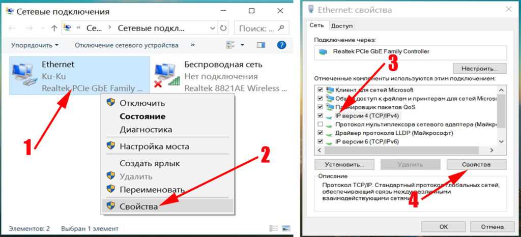 В появившемся окне нажимаем Свойства и выбираем строку Протокол Интернета версии 4 (TCP/IPv4) и снова нажимаем Свойства. В появившемся окне выбираем Использовать следующий IP-адрес и прописываем IP для первого (главного) компьютера — 192.168.0.1, а маску подсети — 255.255.255.0.