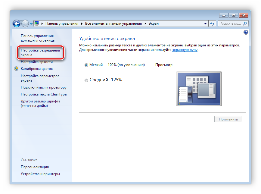 - Слева расположено меню, в котором нужно нажать на пункт «Изменение разрешения».