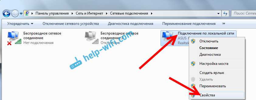 Дальше, нажмите правой кнопкой на адаптер Подключение по локальной сети, или Ethernet, и выберите Свойства.