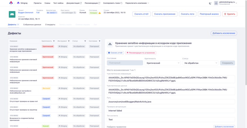 Безопасность мобильных приложений обеспечивается с помощью различных практик анализа защищенности. Каждая из них выполняет свои задачи и находит определенные уязвимости. Например, SAST (статическое тестирование) работает по методу «белого ящика» и сканирует декомпилированный исходный код, DAST (динамический анализ) использует метод «черного ящика» и проверяет ПО в процессе его функционирования, API ST тестирует бэкенд продуктов, IAST (интерактивный анализ) исследует приложения во время их выполнения. Для комплексного обеспечения безопасности мобильных продуктов нужно сочетать несколько практик, но внедрять для каждой из них отдельные инструменты неудобно и затратно. Платформа Стингрей комбинирует все перечисленные методы анализа, что позволяет в рамках единого решения реализовывать ключевые практики безопасности и выявлять более 80 типов уязвимостей. Кроме этого, функционал инструмента дает возможность создавать автотесты без написания кода, в результате время на подготовку сценариев анализа сокращается на 90%.