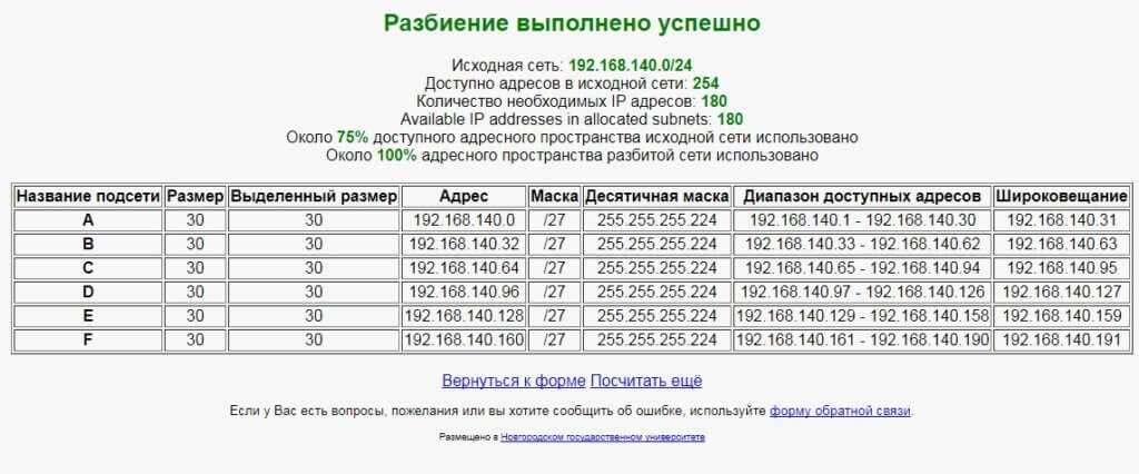 В результате будет представлена таблица с адресами подсетей, диапазонами выделенных адресов, масками, выраженными в десятичном и двоичном видах, именами подсетей и выделенными размерами (числом доступных адресов для устройств). Также пользователю будет предоставлена информация об эффективности использования пространства адресов, выраженной в процентах.