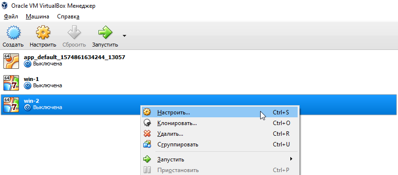 После того, как Windows установлен, настало время настроить сетевой адаптер. Для этого жмем на нашу машину в списке и выбираем пункт «Настроить».