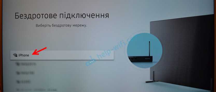Нужно подключить наш телевизор к Wi-Fi сети, которую раздает смартфон. Для этого на телевизоре нужно открыть настройки сети (Wi-Fi), выбрать нашу сеть, ввести пароль и подключиться.