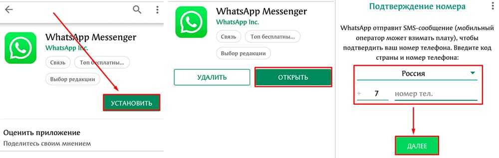 Наиболее простой способ установки приложения Вотсап на Android – скачать программу через магазин Гугл Плэй. Обладатели устаревших моделей телефонов могут воспользоваться неофициальными сайтами. После выбора источника на экране устройства появится иконка WhatsApp в виде зеленого кружочка с телефонной трубкой белого цвета внутри. Здесь предлагается алгоритм действий по установке программного обеспечения: