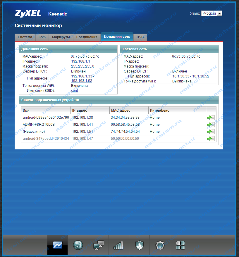 Я буду рассматривать новый интерфейс NDMS v2, которой прошиты все последние партии старых роутеров Zyxel Keenetic и новых Keenetic II.  Чтобы посмотреть подключенных клиентов сети WiFi надо открыть первый раздел — «Системный монитор» и в нем найти закладку «Домашняя сеть». В нижней части страницы смотрим таблицу «Список подключенных устройств».