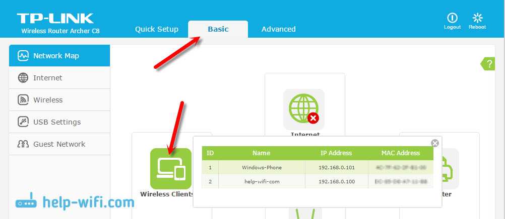 Некоторые топовые модели роутеров от TP-LINK, уже обзавелись новым веб-интерфейсом. В основном, это устройства из линейки Archer (но не все). В настройках, в новой панели управления, перейдите сверху в раздел «Basic» (базовая настройка). Вы увидите карту сети. Там будут беспроводные клиенты. Нажимаем на них, и сбоку, или снизу появится список устройств, которые подключен к вашему Wi-Fi.