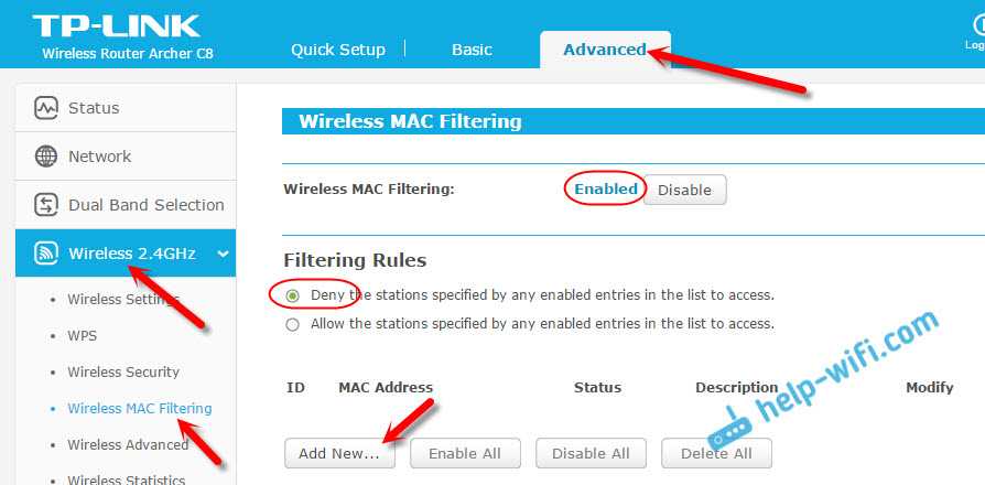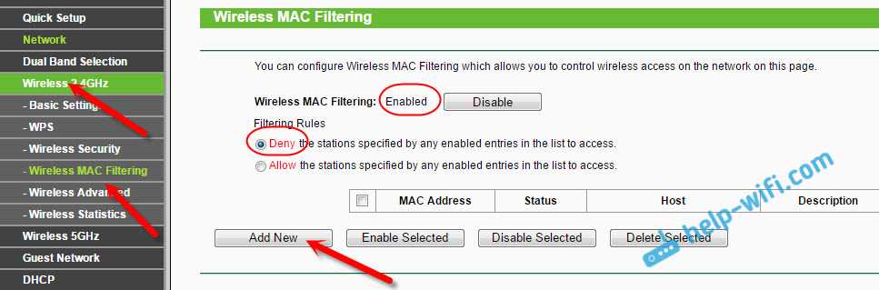 Фильтрация должна быть включена (в статусе Enabled). А настройки блокировки в статусе «Deny» (Запретить). Нажмите на кнопку «Add New» (добавить), что бы добавить новое устройство.