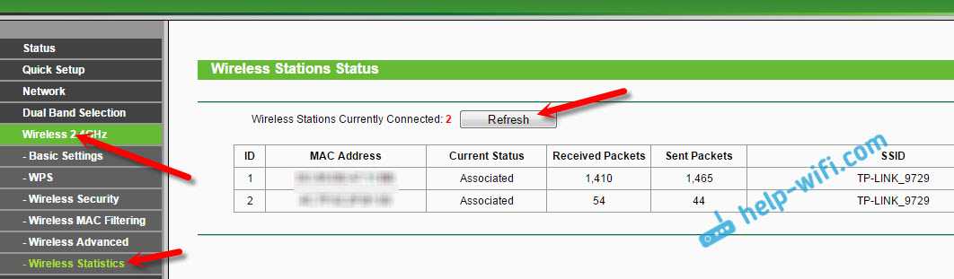 В других моделях этого производителя после входа в панель управления, необходимо найти раздел «Wireless» и в нем выбрать подраздел «Wireless statistics» или найдите раздел «Active Session».