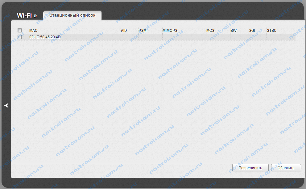 Практически на всех современных моделях этого производителя так же используется единый стиль веб-интерфейса. Узнать кто подключен к сети WiFi роутера можно в Расширенных настройках в разделе «Статус» > «Клиенты или Wi-Fi» > «Станционный список». Последний вариант предпочтительней, так как можно сразу отключить злоумышленника, поставив галочку рядом с его MAC-адресом и нажав кнопку «Разъединить».