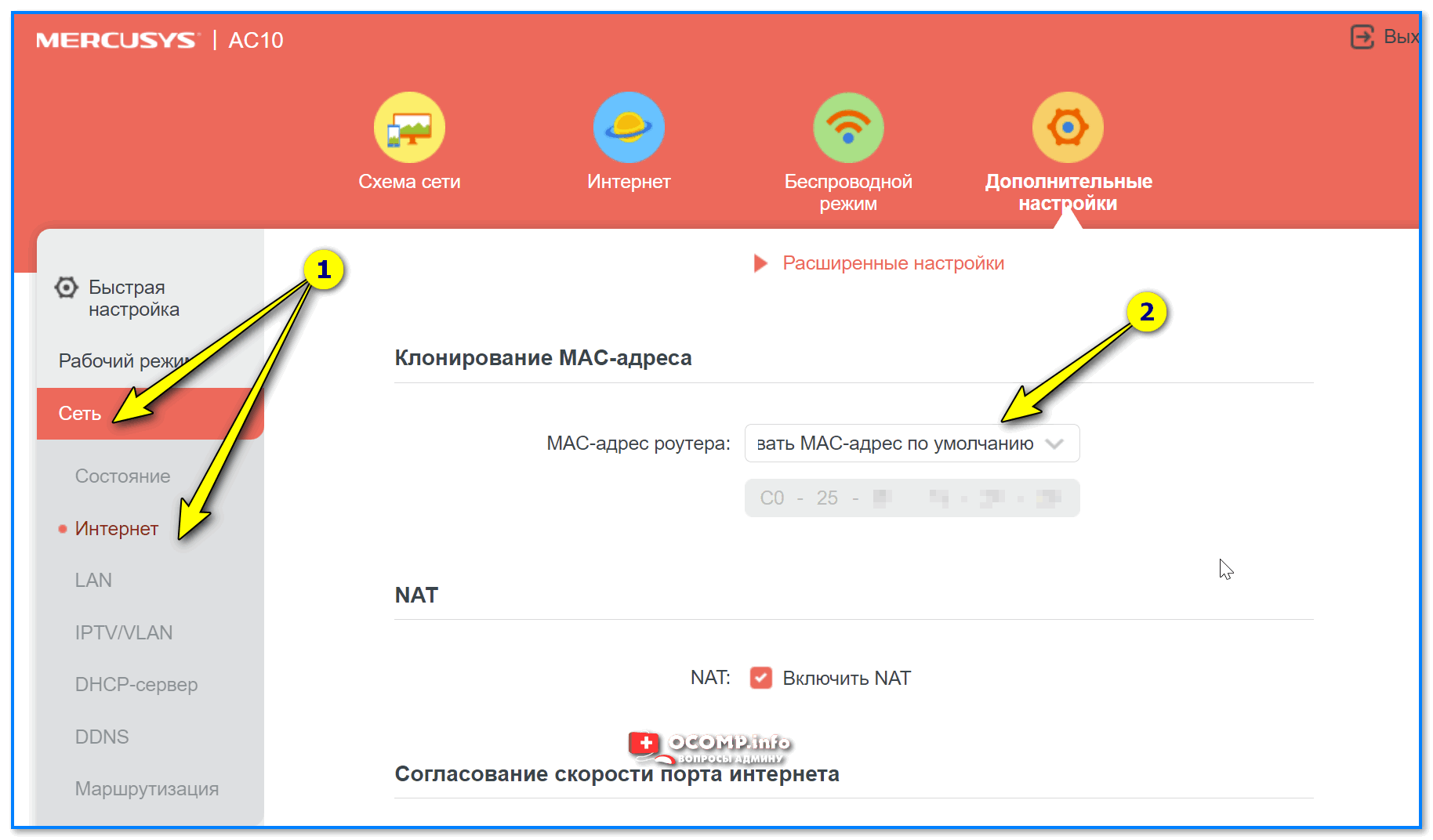 Сеть — интернет — Mercusys (клонирование MAC-адреса)