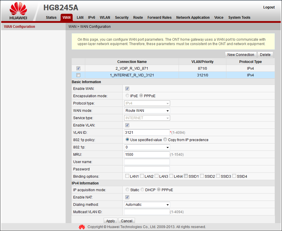 Настройка модема HUAWEI HG8245A начинается с перемещения на страницу «WAN».