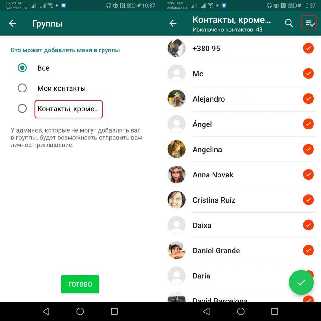 Хотя опции «Никто» и не существует, вы можете выбрать все контакты в опции «Контакты, кроме…» и таким образом запретить абсолютно всем своим контактам добавлять вас в группы.
