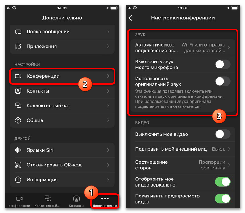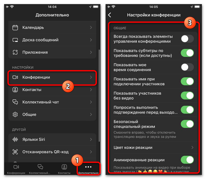 В категории «Конференция» можно изменить основные параметры звука – задействовать автоматическое подключение микрофона, деактивировать шумоподавление для сохранения оригинальной дорожки и многое другое. При этом каждый параметр в будущем легко меняется во время сеанса связи.