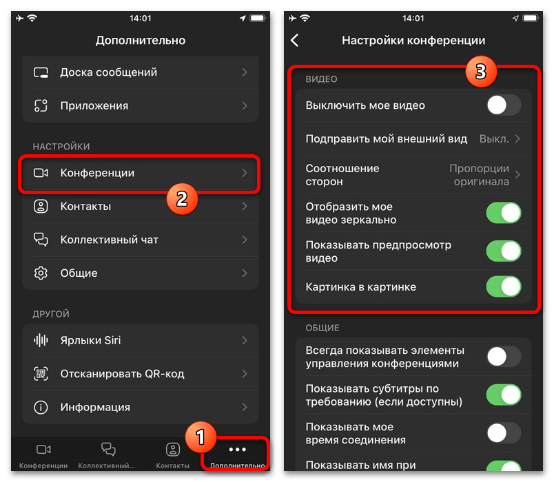 Куда более объемным разделом являются «Общие» настройки, представленные, опять же, на странице «Конференция». В данном случае можете задействовать принудительный показ элементов управления во время сеанса связи, отображение субтитров, время соединения и видео с камеры каждого участника.
