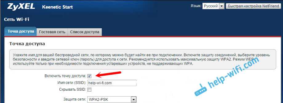 На ZyXEL Keenetic, в разделе «Wi-Fi сеть» должна стоять галочка возле пункта «Включить точку доступа».