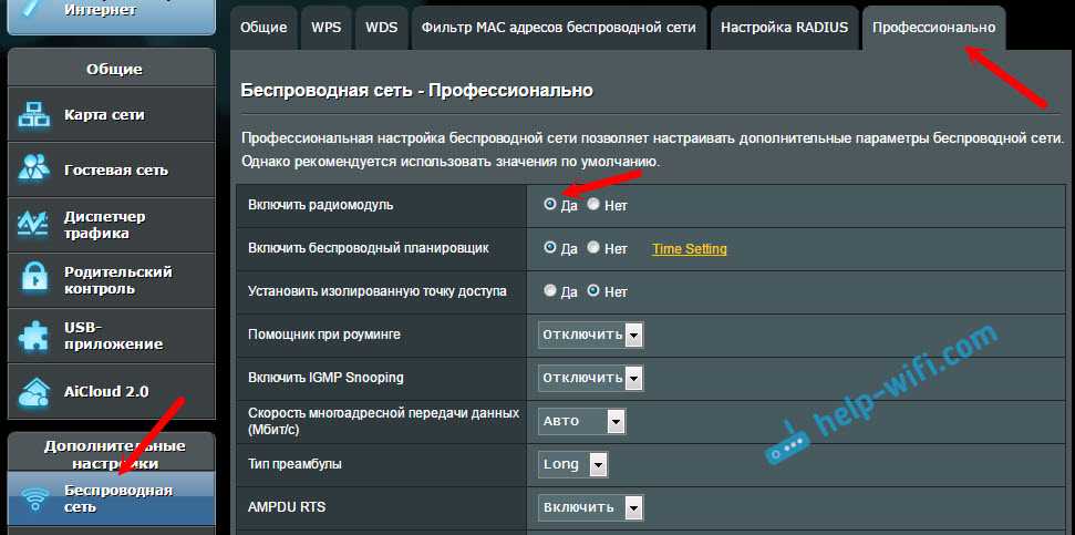 На маршрутизаторах ASUS открываем раздел «Беспроводная сеть», вкладка «Профессионально». Напротив пункта «Включить радиомодуль» переключатель должен стоять возле «Да».