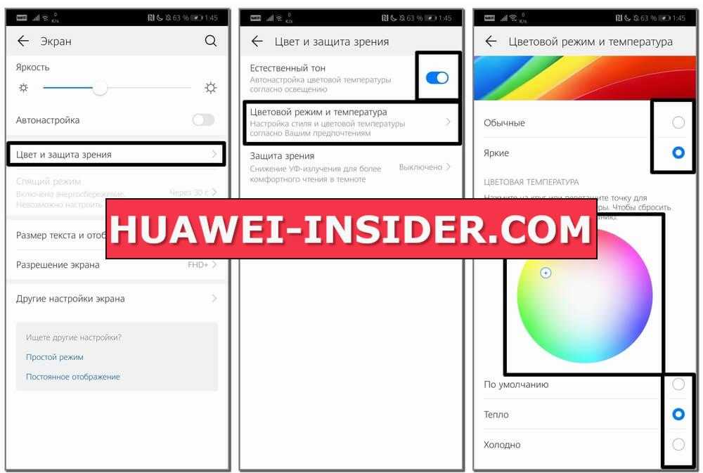 - Можно выбрать вкладку «Цветовой режим и температура» и самостоятельно задать образ оформления дисплея устройства.