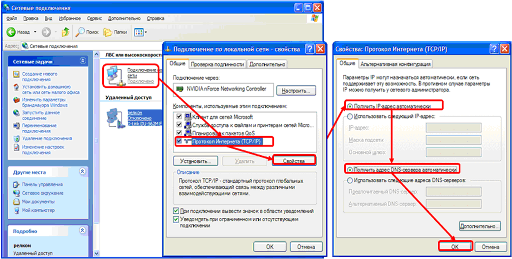 - Отметить галочкой «Получать автоматически» напротив выбора IP и DNS.