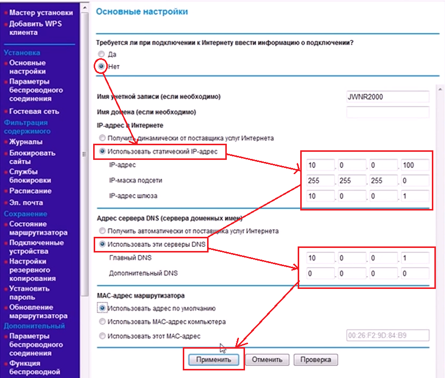 Если ваш провайдер предоставляет вам интернет по статическому IP-адресу, выберите вариант «Нет». Укажите IP-адреса и DNS-серверы – эти сведения должны быть указаны в соглашении с провайдером.