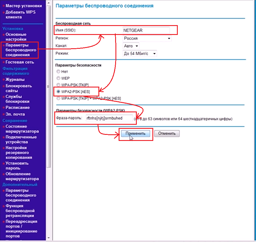 - В поле «Режимы безопасности (WPA2-PSK)» вводим ваш пароль для беспроводной сети;