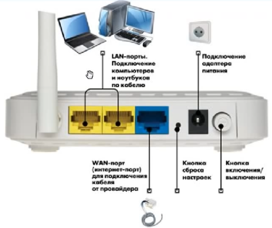 - Интернет-вход (желтый) — сюда подключаем кабель, который вам кинул провайдер.