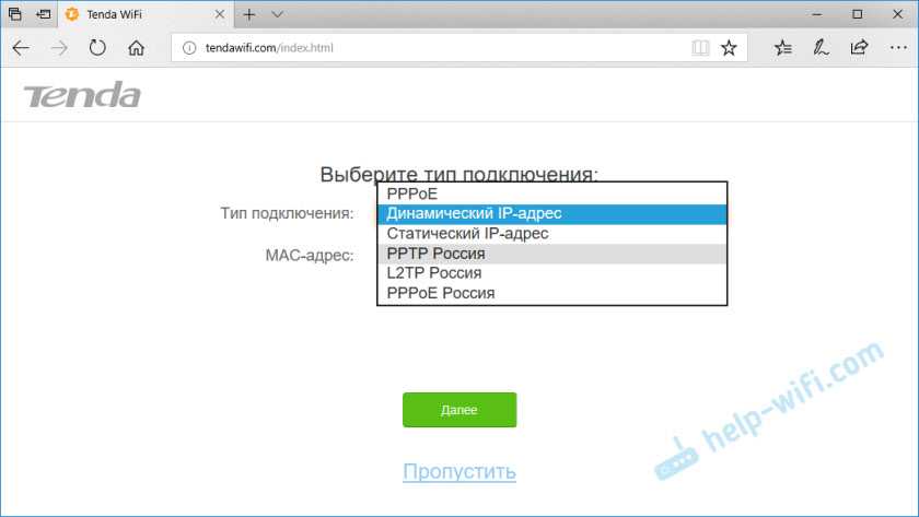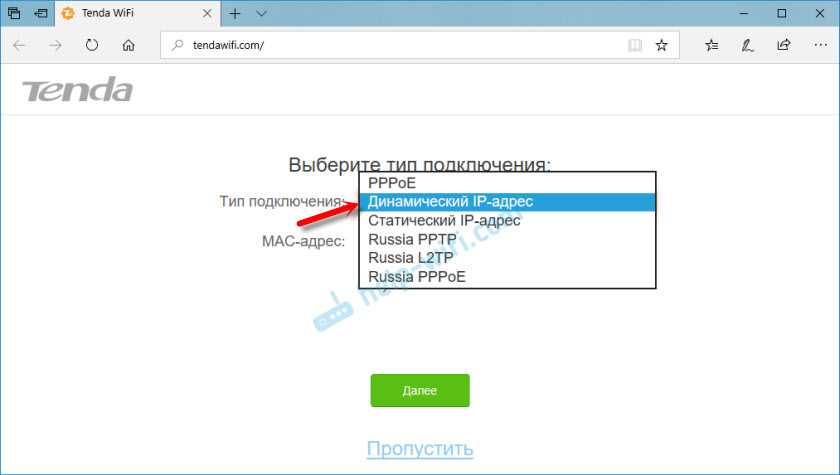 И если кабель в WAN порт подключен, то роутер предложит вам выбрать тип подключения к интернету. Это очень важные настройки, вы должны знать точно, какой тип подключения использует ваш провайдер. И делает ли он привязку по MAC-адресу. У меня «Динамический IP», там настраивать ничего не нужно.